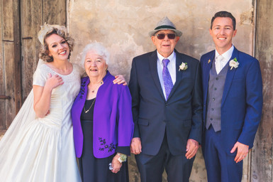 Because we had an uneven number of bridesmaids to groomsmen, it felt silly to try to match the colors, so we run the gambit. We had each male member of the group wear a tie and socks that did not match the color of their boutonniere, which was made from the same fabric in the bouquets. For example, Vince in the green tie, had blue and goldenrod in his boutonniere, which means his socks were either pink or purple, and so it was for the other groomsmen. Each boutonniere had one white flower, tying them all together. The fathers had the same flowers as each other- pink and goldenrod. Grandma and Grandpa had a special set. with 5 brides and 4 mother, grandma stuck out, so hers and grandpa's were made out of the maid of honor's color- the green burlap roses with the pearls, setting them apart from the others.
