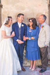 When it came to the corsages for our mothers, we wanted something that would be functional and beautiful. So, using the same fabric flowers from the bouquets, we made them timepiece corsages and gifted them to them at the rehearsal dinner in the same teacups I gave to the bridesmaids. We thought it would be fun if each faction of our family wore a color to match the bridesmaids, so we asked my dad's side to wear purple, my mom's side to wear pink, and his side to wear blue. This helps up match the corsages to their dresses.